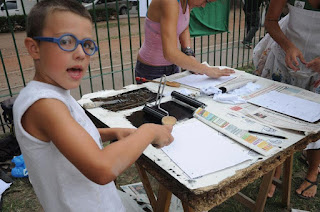 Con una propuesta participativa y solidaria pudieron integrar a vecinos y transeúntes ocasionales compartiendo las técnicas de estampa con cuchara de madera y de estencil. Las matrices que se usaron fueron diseñadas por Carolina, Oscar y por mi; con consignas contra la megaminería trasnacional y "Famatina no se toca" y "En Famatina no hay derrota". Desde ya felicito la iniciativa de este grupo de artistas que resistieron hasta que la lluvia se impuso. M,C.